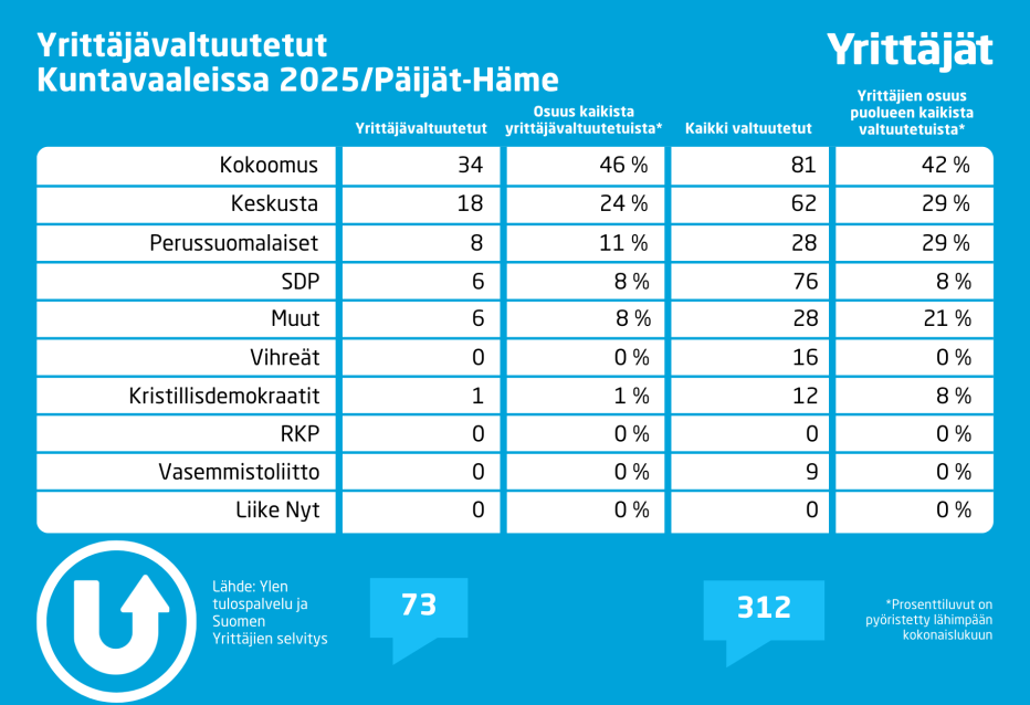 Aluevaaleissa Päijät-Hämeen hyvinvointialueen aluevaltuustoon valittiin 12 yrittäjää, eli yli 17 prosenttia alueen 69 valtuustopaikasta. Varasijalle valittiin 13 yrittäjätaustaista ehdokasta.