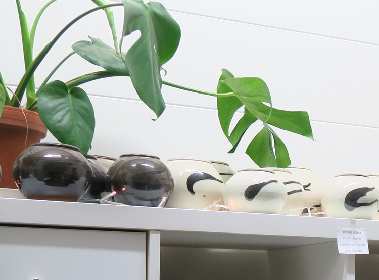Tuhka voidaan laittaa asiakkaan omaan astiaan, tai uurna voidaan valita hyllystä. Tarjolla on puisia ja keraamisia rasioita, suurin osa valitsee pahvisen.