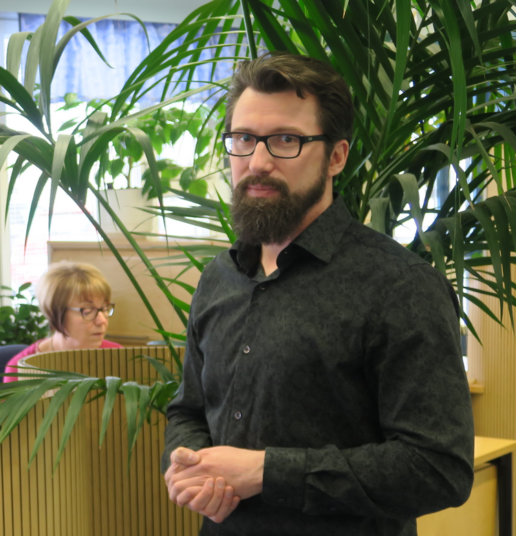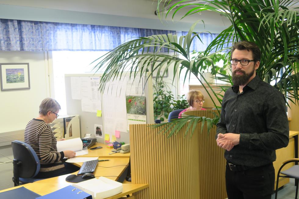 Toimitusjohtaja Marko Torni korostaa, että töissä saa myös viihtyä. Koti-Karjalan toimisto on maisemakonttori muutenkin kuin väliseinien puuttumisen vuoksi. Viherkasvit ovat oikeita ja hyvinvoivia, niiden hoito on ulkoistettu alan yrittäjälle.