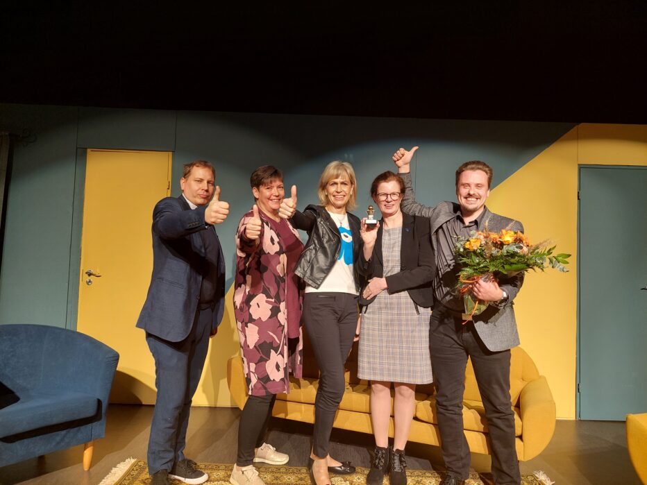 Palkinnosta iloitsemassa Ylihärmän Yrittäjien puheenjohtaja Matias Keskinen, Kauhavan Yrittäjien puheenjohtaja Johanna Salla-Uitto, Alahärmän Yrittäjien puheenjohtaja Päivi Sillanpää ja vt kaupunginjohtaja Liisa Salo sekä kehitysjohtaja Juha-Martti Kuoppala.
