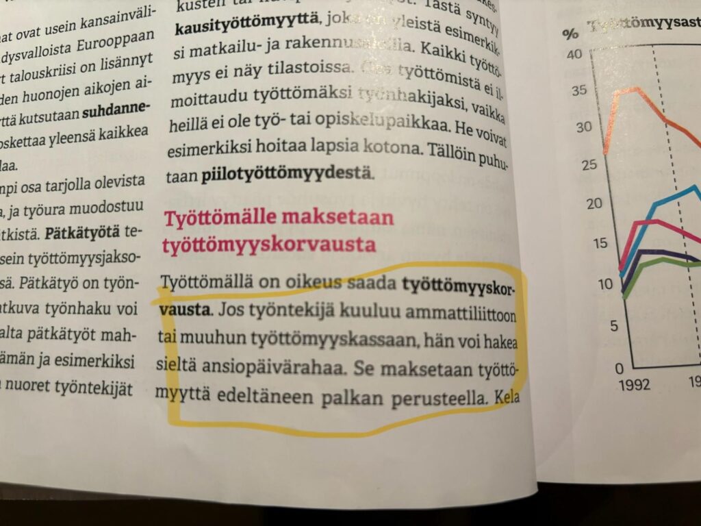 Hellstén havaitsi oppikirjassa virheitä liittyen työttömyyskorvaukseen. Kirjassa väitetään, että työtön voi saada ansiopäivärahaa ammattiliitosta.