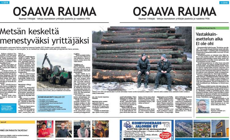 Vuoden ensimmäisessä numerossa esittäytyvät Vuoden nuoret raumalaiset yrittäjät 2017, Koneurakointi Hallion veljekset Matias ja Juho. Heidät palkittiin syysjuhlassa, jossa Vuoden yritykseksi valittiin VMP-interior. Rakastunut Raumaan -kauppiaiden valitsema vuoden 2017 yrittäjä Rami Valo kertoo lehdessä miten kenkäliike on kulkenut suvussa jo pitkään. Kaupungin sydän, tori, esittäytyy myös Osaavassa Raumassa. Yrittäjän äänen tuo esiin hallituksemme uusi jäsen, Tuomas Soronen Sorcolorista. Kumppaneistamme esittäytyy Eurajoen Säästöpankki.