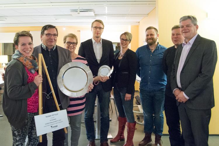 Kuva: Rauman Yrittäjien hallituksen edustajat iloitsevat Satakunnan Vuoden paikallisyhdistys -tunnustuksesta. (Kuva: Tarja Aho)