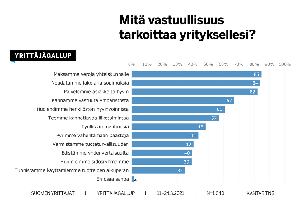 Yrittäjägallupin vastausten perusteella yrittäjät näkevät vastuullisuusajattelun laajasti. Useimmin mainittuja vastuullisuustekoja ovat verojen maksaminen, lakien ja sopimusten noudattaminen, asiakkaiden hyvä palvelu, vastuun kantaminen ympäristöstä sekä huolehtiminen henkilöstön hyvinvoinnista.