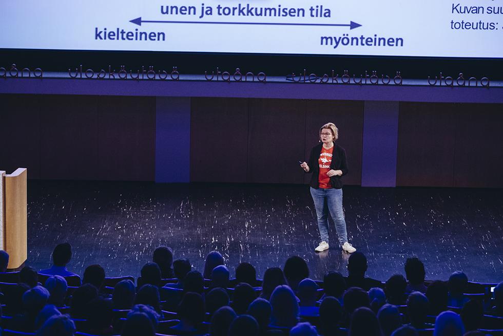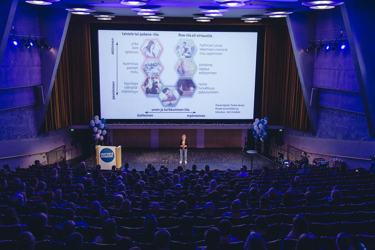 Päivän ensimmäinen puhuja, aivotutkija ja kasvatustieteiden professori Minna Huotilainen herätteli yrittäjiä huolehtimaan aivojen hyvinvoinnista. Arjen stressi, kiire ja kuormitus saavat kehon taistele tai pakene -tilaan, joka ei ole ideaali työntekemiseen. Yrittäjänkin tarvitsee palautua työstään.