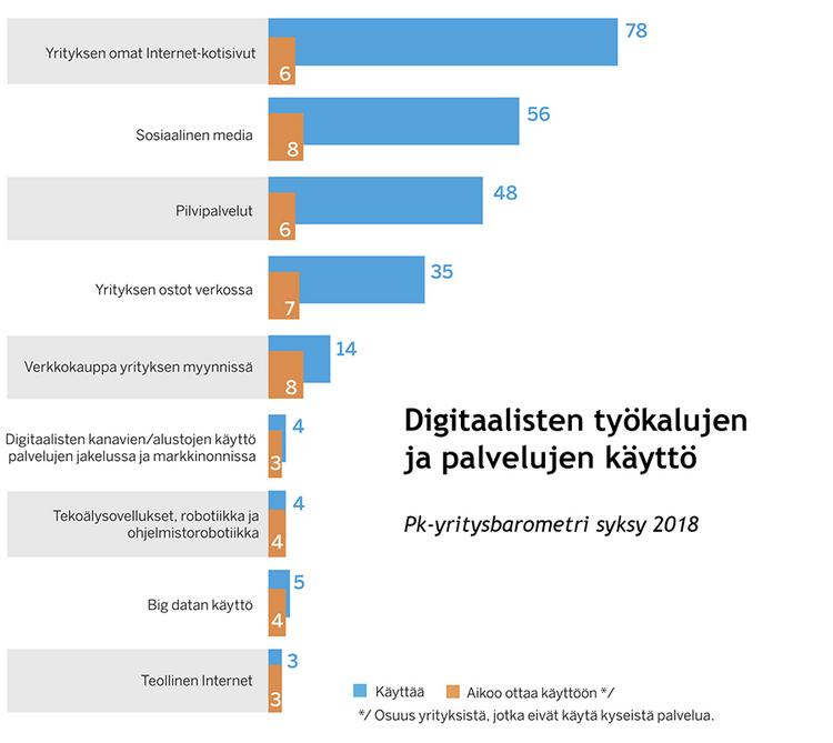 Työ- ja elinkeinoministeriön selvitysten mukaan kansainväliset pk-yritykset hyödyntävät digitaalisia työkaluja muita enemmän. Tekoälyä ja robotiikkaa hyödynsi barometrin mukaan vain neljä prosenttia pk-yrityksistä. Saman verran aikoi ottaa ne käyttöön tulevaisuudessa.