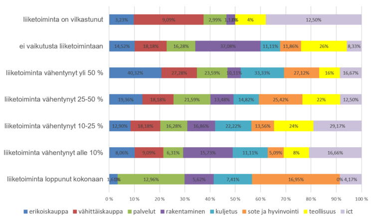 Toimialoittain tarkasteltuna erityisesti koronakriisi on vaikuttanut alueellamme erikoiskauppaan, sillä yli 40% ilmoittaa liikevaihdon vähentyneet yli 50% (liite kuva). Vähentyneiden kuljetusten osalta kuljetussektori ilmoittaa vaikutusten olevan suuret. Liiketoiminta on kasvanut ict ja vähittäiskaupan aloilla. Rakentamisen toimialaan vaikutukset ovat olleet vielä vähäisemmät.
