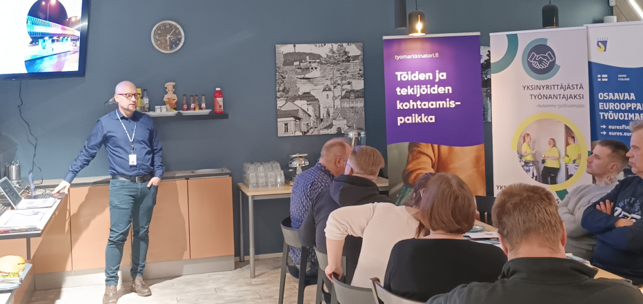 Työllisyyspalveluiden edustajat Jaana Kattainen ja Sanna Laitinen esittelivät TyöNavigaattorin palveluja, joilla tuetaan työn ja tekijän kohtaamista Kuopion työllisyyspalveluiden alueella. TyöNavigaattori tarjoaa maksuttomia rekrytointipalveluja ja järjestää rekrytointitapahtumia yrittäjien ja työnhakijoiden tueksi.