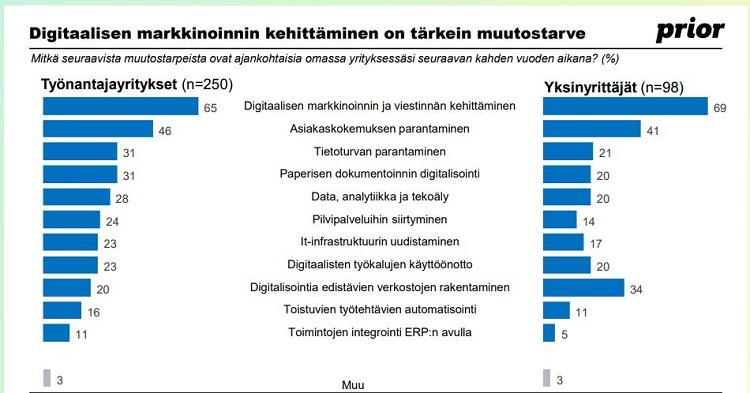 Eniten digiosaamissatsauksia aiotaan laittaa markkinointiin ja myyntiin. Yksinyrittäjät aikovat satsata myös tuote- ja palvelukehitykseen.