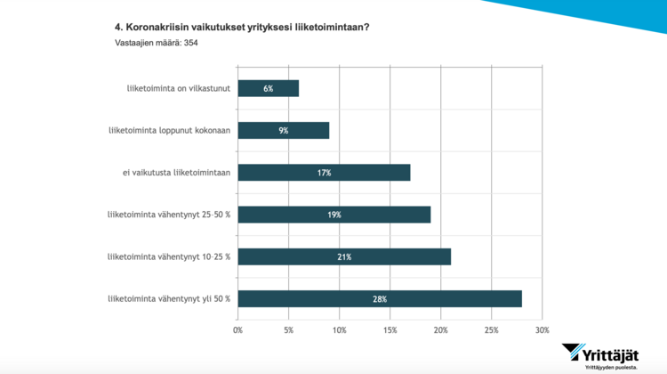 Kolmen kuukauden poikkeusolojen jälkeen muutos tilannekuvassa on selvä – kriisin alkuvaiheessa kahdella kymmenestä yrityksestä liiketoiminta loppui kokonaan ja nyt samassa tilanteessa olevia on enää 10 % yrityksistä.