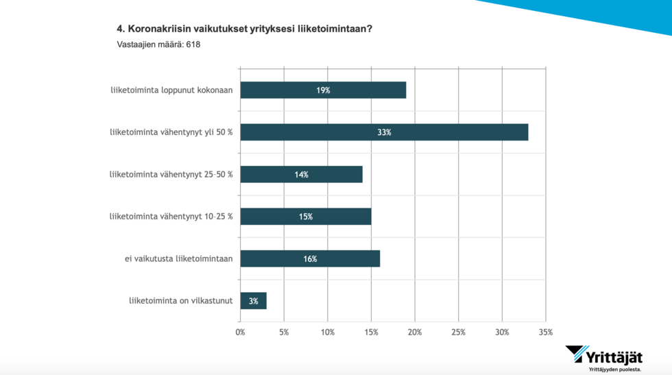 Kuukauden kestäneen poikkeusolosuhteen jälkeen toteutetun toisen tilannekuva-kyselyn perusteella arviot konkurssien tai toiminnan lopettamisen osalta ovat saman suuruiset kuin ensimmäisessä kyselyssä; viisi prosenttia yrityksistä arvioi, että liiketoiminta on kriisin jälkeen kokonaan loppunut.